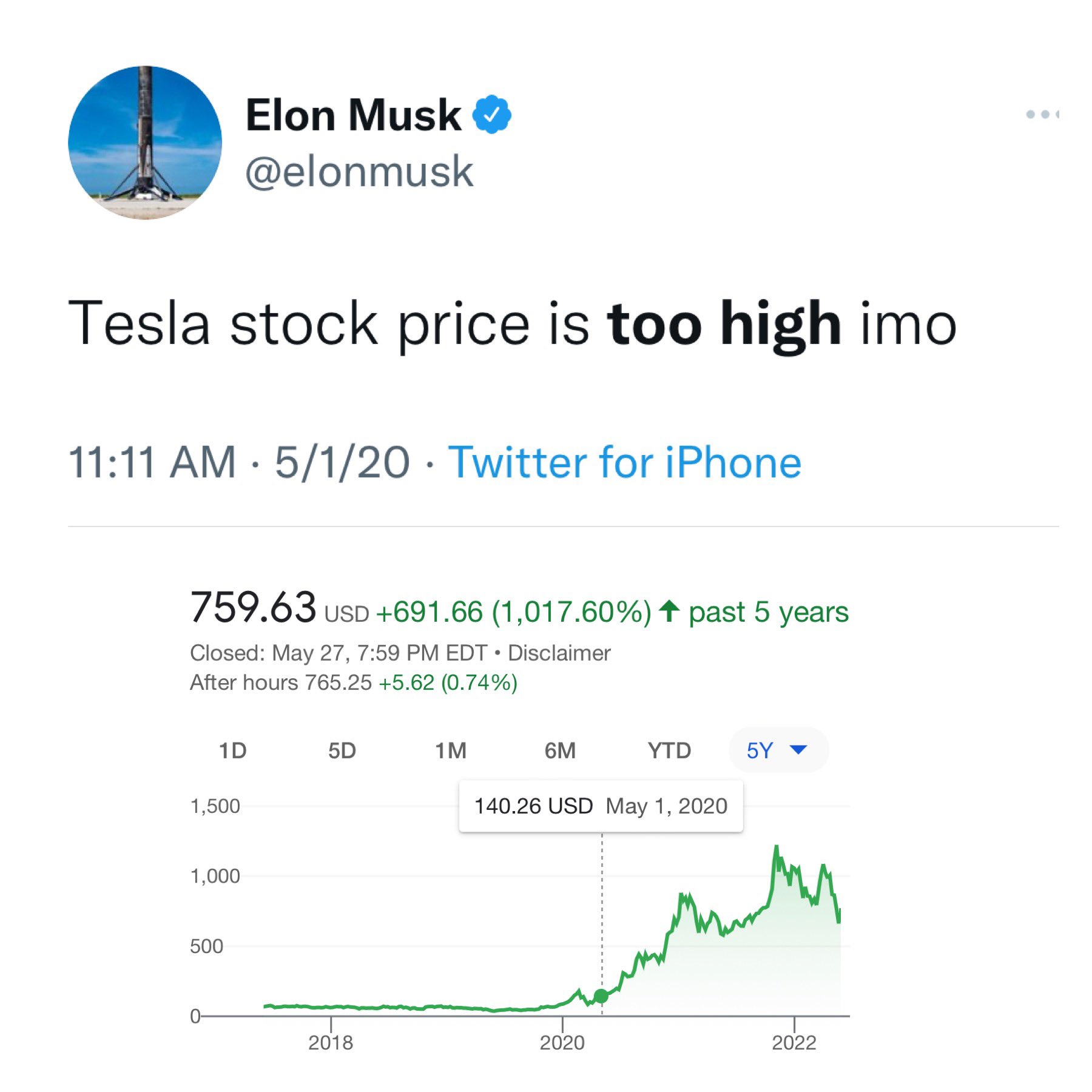 Tesla stock falls 12 after string of Elon Musk tweets about selling stock. He over-paid for Twitter to the tune of 44 billion dollars to take it private and took on a huge loan that will cost him 1 billion a year in interest. Ive gone on the record several times that the stock price is higher than.